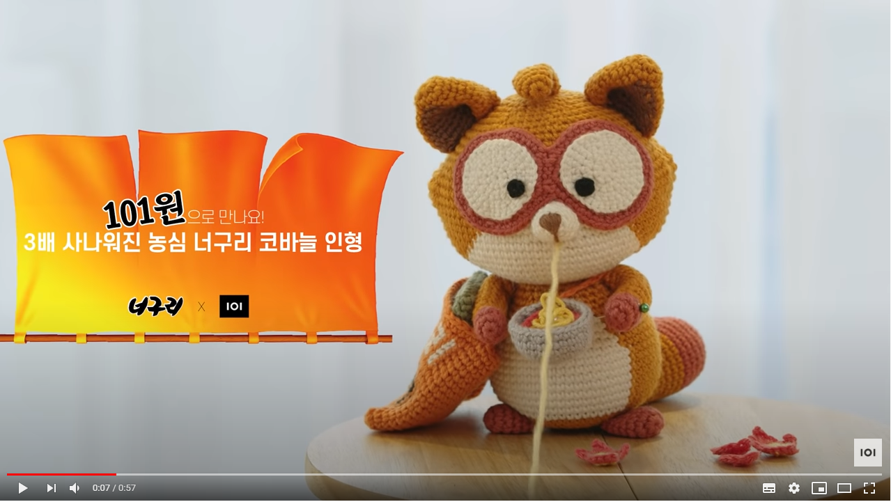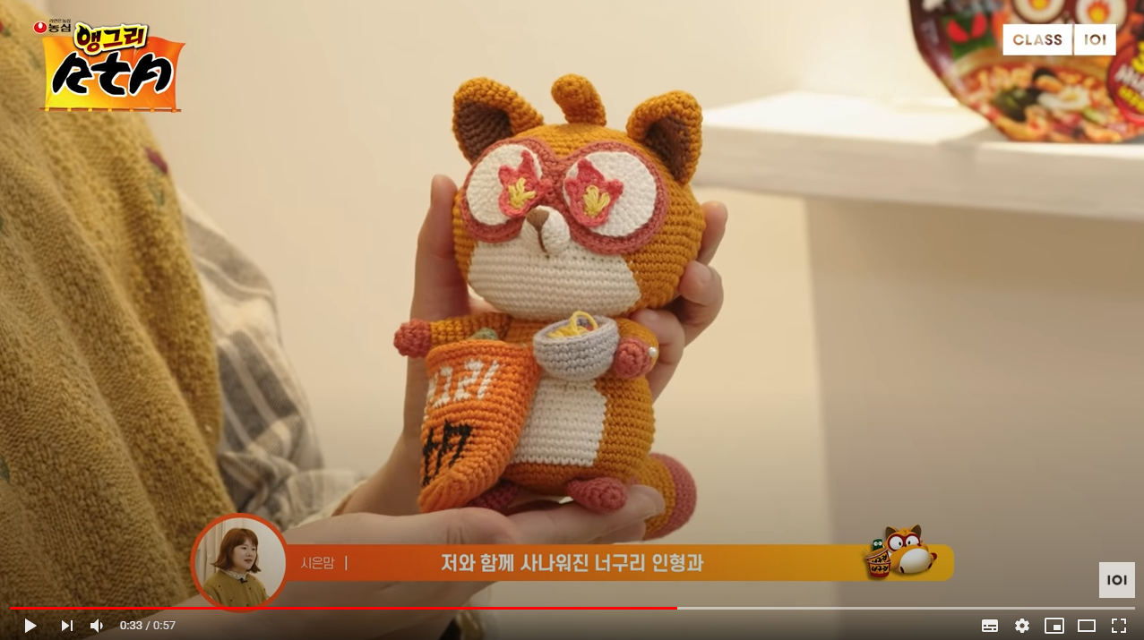 클래스 101에서 바로 너구리라면 광고의 익숙한 그 워딩 "너구리 한 마리 몰고 가세요"를 작가 시은맘이 외친다. 썸네일을 보고 들어온 사람들이라면 당연히 알고 있을 이야기를 초반에 배치하여 이 영상은 너구리 라면의 너구리 인형을 준다, 만들 수 있다는 기대감을 충분히 주고 유지시킬 수 있다.