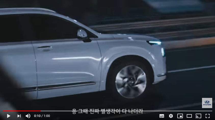 사람들은 싼타페 광고에 왜 차가 2초도 안나오냐고 타박했지만, 가장 차가 제 역할을 하는 순간들이라고 생각합니다. 우리는 차를 살 때 가장 많이 고려하는 것은 역시 차량의 디자인, 성능, 가격들이 있습니다. 하지만, 차를 사고 나서 부터는 차의 외관은 잊혀집니다. 운전을 하는 운전자도, 차에 타는 동승자도 역시 차창 밖 정면을 바라보면서 가기 때문에 차안에서의 모습들은 '내가 이 차를 타고 다녔던 순간들'로 귀결됩니다.